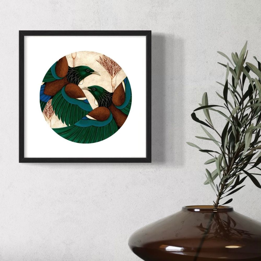 Featuring two beautiful NZ native Tūīs with a Nīkau palm background.